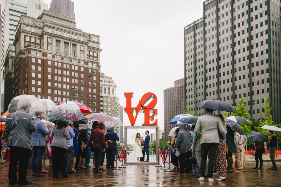Couple holding hands during their ceremony. They hid under the iconic LOVE statue to stay out of the rain.